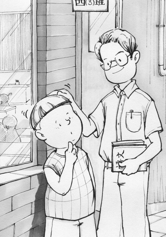 一百二刚刚回到教室坐下,方老师又来到一百二的跟前。一百二站起来说:“方老师好。”