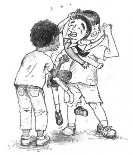 杨皮皮站在他们俩旁边,用手指了指肩膀上的绶带,希望用这个动作来告诉他们,自己是今天的文明监督员,请他们守纪律一点,否则他可是有权力扣除他们的班级积分的。但是这对黑胖子和白胖子几乎没有任何的威慑力,在杨皮皮的红绶带前,黑白胖子兄弟俩越发大胆和放肆了。“一网不捞鱼,二网不捞鱼,三网捞起一尾巴鱼,啦啦啦啦啦……”他们继续唱,当唱到“啦啦啦”的时候,不仅唱还做出蹲马桶的动作,“啦啦啦啦啦……不好……拉出来啦!”惹得全班同学哄堂大笑。