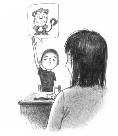 杨皮皮听完不假思索,“腾”地从座位上站了起来,用洪亮的声音问道:“请问老师您是公猴还是母猴呀?”