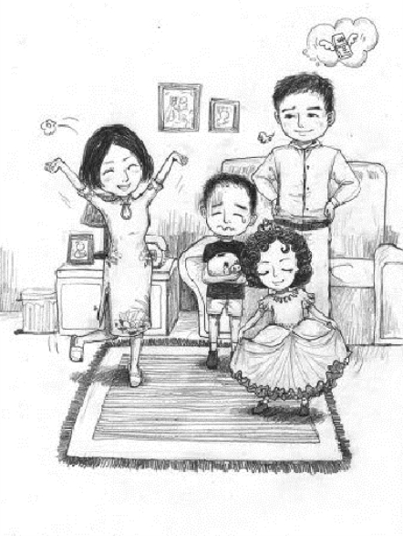晚上,淡定爸送给冲动妈一条漂亮的新式旗袍裙,杨皮皮送给大大小姐一条美丽的蓬蓬裙。冲动妈和大大小姐穿上裙子以后,像电视里的模特一样好看极了。淡定爸和杨皮皮看着看着,忽然感觉到很幸福,因为家里有两个爱穿裙子的女生真美好啊!