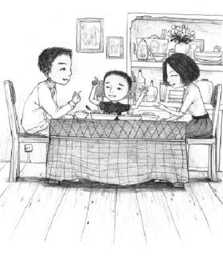 晚上一家人坐在饭桌旁,各自说着自己一天的遭遇。杨皮皮还没说完,冲动妈就抢过去说。冲动妈还没说完,又被杨皮皮打断,就连淡定爸也不时插话呢,饭桌上叽叽喳喳,好不热闹。