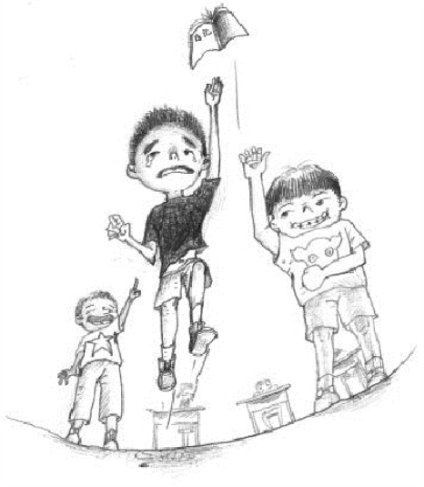 “快来看呀!快来看杨皮皮的梦想喽!”正撑着脑袋神游的杨皮皮,忽然听见身后有人提到自己的名字,回头一看,原来是黑胖子和白胖子,这两个可是经常调皮捣蛋的学生。
