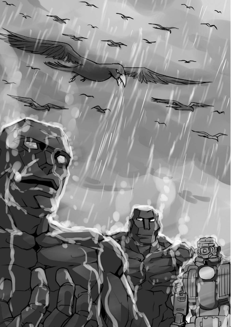 在“大雨”中,火怪们和地精一族的机器人全身都湿透了。