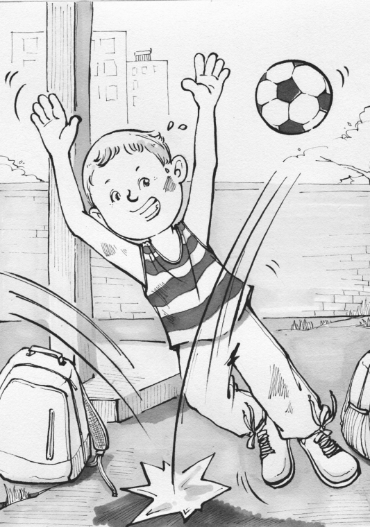 丁冬在两只书包之间跑得上气不接下气。有几次,球以炮弹之势,将丁冬与球一块儿送进“门”里。还有几次,球毫不含糊地撞在丁冬的身上,把丁冬撞倒在地。