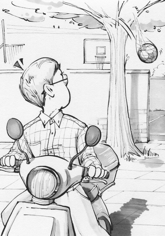 就这样,丁建国将摩托车骑到了篮球场这边,算是对他即将开始锻炼的地方进行实地考察。