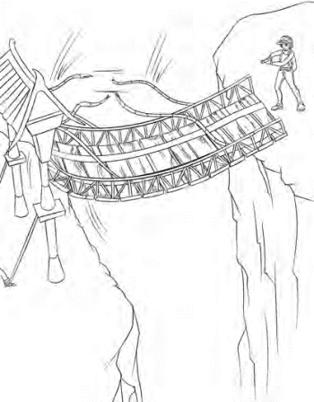 对面如削的石壁上有一个洞口,洞前悬着一个吊起的吊桥,吊桥放下,正好可以横在深涧上,让人通过。