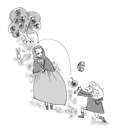 发明说:“据我所知,有个人居然在牛顿旁边画了一个女朋友,因为他觉得遗憾,他觉得为什么坐在苹果树下的就牛顿一个人呢?为什么不是两个人呢?要是苹果打在牛顿女朋友的头上,而不是落在牛顿头上,那情景会是怎么样的?他会忘记自己的发明灵感,而是给女朋友赔礼道歉哄她开心吗?嘿嘿,想想吧,万有引力,多么浪漫富有诗意的名字,为什么我们不可以有更多更浪漫的情节呢……”