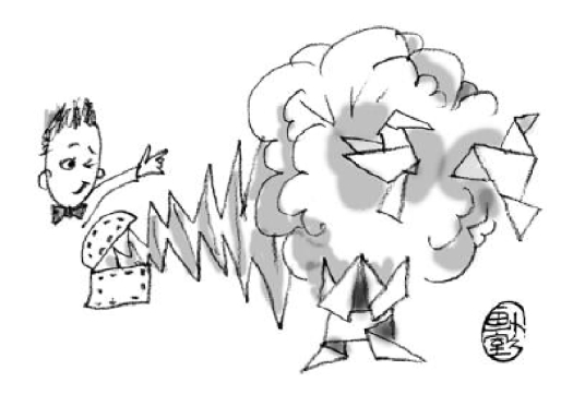安依依做了一个会伸缩的魔术盒,据说是经过了几百遍的试验,最后才成功的哦——这个魔术盒果然不同凡响,因为外面看起来就像一朵花,打开也没什么特别的,可是如果你拨一下下面火柴棒的机关,盒子里面会跳出一只青蛙来,不是真的青蛙哦!是纸做的哦!可是还是会吓一跳的啦,因为太突然呗。安依依得意地说,这可是她经过千百次的试验才成功的哦,跟诺贝尔试验炸药的成功概率差不多了!安依依还说,希望发明老师有机会把这个魔术盒送给他的女朋友,最好在情人节送,因为这就是比喻发明老师是青蛙王子在求婚哦!
