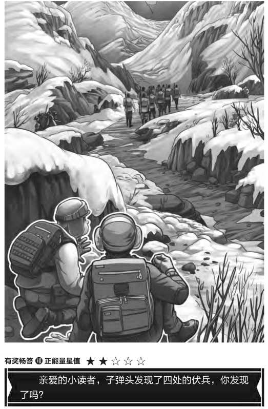 就在他们准备继续前进的时候,子弹头一声惊叫:“不好!有伏兵。快隐蔽!”大家迅速地躲藏到了石头和粗大的冰溜后面。