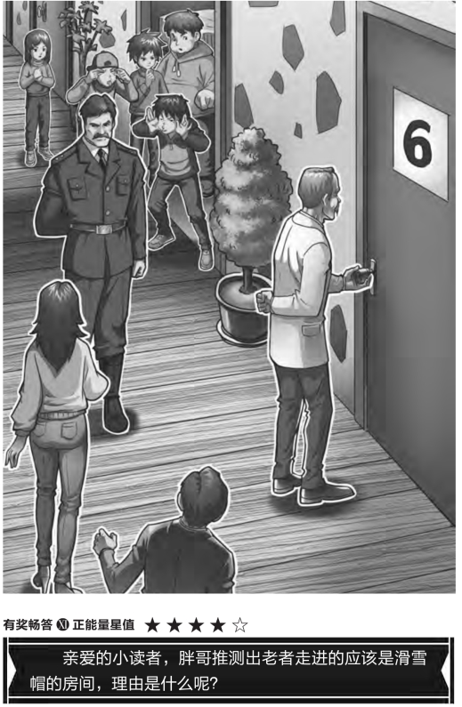 “我现在就去看看。”猴儿立即跑了出去,不一会儿又跑了回来,说,“一点儿没错,滑雪帽就是从右数第六扇窗户跳出去的。旅店的每个房间都只有一扇窗户,而老者所在的房间,正好是6号房间。”