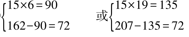 因为牧场上原有的草量是一定的,所以上面两式的差207-162=45,正好是9个星期生长的草量与6个星期生长草量的差。这样就可以求出每星期草的生长量是45÷(9-6)=45÷3=15。