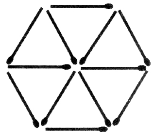 图—42中是用12根火柴摆成的6个等边三角形。移动两根火柴,使它成为4个等边三角形。继续移动,图形会变成3个等边三角形、2个等边三角形。三角形的大小可以不一样,但不能重复。你能做到吗?