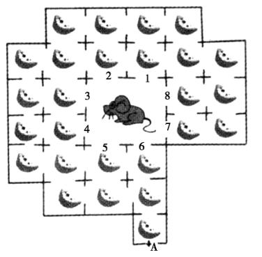 如图所示,每间房子里都有一块甜饼。老鼠芭芭拉想一次吃完所有的点心后,从A门出来。请问芭芭拉从1~8中的哪扇门进去,才不走重复路线?(每间房只允许进出各一次,并且不许从同一扇门进出)帮芭芭拉想一想该怎么走?