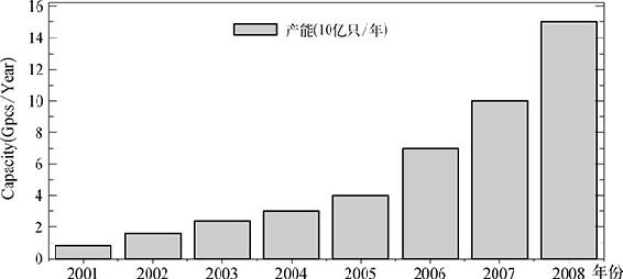 经过不懈的努力,顺络电子的生产能力迅速提高,从2001年产能不到10亿只扩大到2007年的100亿只,预计2008年底达到150亿只的生产能力(参见图4.1)。