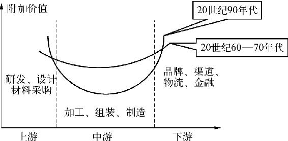 在现实的创业过程中,做产品企业的商业模式,做品牌企业的商业模式,做文化企业的商业模式,做规则企业的商业模式,做“宗教”企业的商业模式等,依次递进,其商业模式关系越来越复杂。参见图8.3所示的微笑曲线,一个产业链上的价值总和是一定的,分布在产业链的上、中、下游上。在20世纪60—70年代附加价值差别不大,那时的制造业还是能够获得较高经济回报的。到了20世纪90年代,这个现象发生了巨大的变化,制造业者往往只能够获得“血汗钱”的回报,做产品的企业仅仅能够维持简单再生产。制造业者赢得的那么点“血汗钱”是没有办法投入更多资金进行深度研发的,也就是这类企业将永远地跟在创新型企业的后端,获得产业链上产品制造的利益。耐克,以其研发设计创新能力和材料采购控制能力,能够获得巨大的附加价值的回报。它没有一间制造产品的工厂,前些年由于其运动鞋的后跟刻有阿拉伯字符,大有亵渎伊斯兰教嫌疑,遭到阿拉伯国家反对,一次就销毁了十多万双鞋。同样,沃尔玛从来不制造一件产品,它掌握着品牌、市场渠道、物流控制权以及金融支持和服务手段,它的销售额已经连续多年位居世界500强的前列。