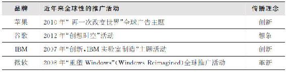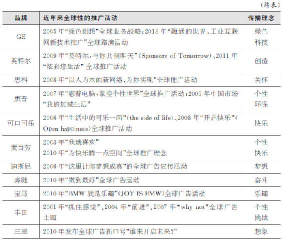 在文化一元化与多元化的冲突中,大多数国际品牌大都能树立起平等、协商的传播理念,以“一种对话立场”来进行知识的、专业的、审美的跨文化传播。顺利的品牌传播活动从某种意义上来说也是企业与消费者之间的社会性交往行为,哈贝马斯认为社会交往行为指的是“至少是两个以上的具有语言能力和行动能力的主体之间通过符号协调的互动所达成的相互理解和一致的行为,行为的有效性要求是真实性,正当性与真诚性”。(注:哈贝马斯.交往行为理论[M].曹卫东译.上海:上海人民出版社,2004年版,第83页。)只有在兼顾双方的利益,将各种文化作为彼此平等的个体平等对待的前提下,才能充分发挥不同文化变量在品牌传播过程中的作用。成功的国际品牌大多深谙此道,从样本品牌近年来全球推广活动的主题(见表3)来看,基本都集中于“环保、快乐、创新、科技”等能跨越文化的障碍的主题。