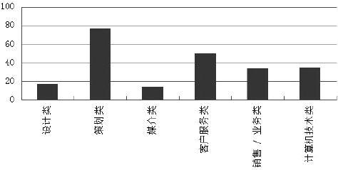 本次研究首先统计了广告企业对不同类型的职位人才的需求情况(见图1)。从图1中可以看出,广告企业对广告人才的需求主要还是集中在设计、策划、媒介、客户服务及销售/业务5大类广告企业核心岗位,对这5大类岗位的广告人才需求量占总招聘岗位数的72.9%。