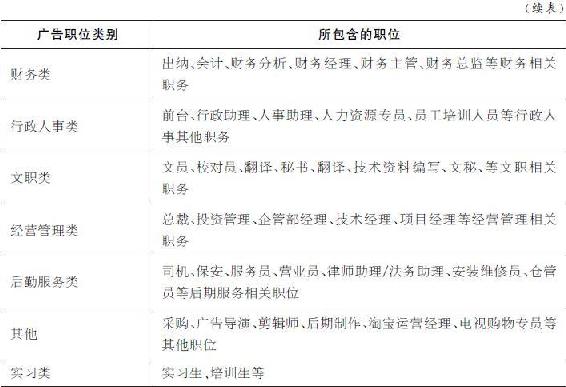 本研究信息的获取主要通过前程无忧、智联招聘、若邻社交招聘网、中华英才网等国内知名招聘网站。在这些招聘网站中以具体企业名作为搜索关键字进行检索,筛选出近一个月以来这些企业发布的招聘信息。并对检索出的信息进行重复职位的删除、清理,以获取该广告企业的有效招聘信息。经统计,收集到非媒体服务类广告企业招聘职位660个,媒体服务类广告企业招聘职位306个,共计966个职位的招聘信息。