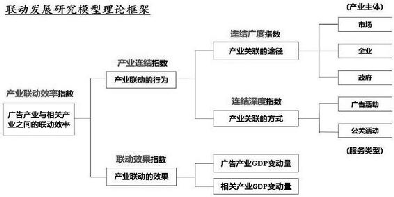 基于以上思考,本文立足于广告产业本身并借助于产业经济学与传媒经济学理论,试图针对广告产业与关联产业联动发展建立具有普适意义的研究模型,并通过双向(行为与效果)多维度(方式、路径等)的分类与量化建立详细的指数体系,以期在逻辑上对广告产业与某一产业联动现状进行体现,同时从指数出发得出有针对性的产业发展策略。