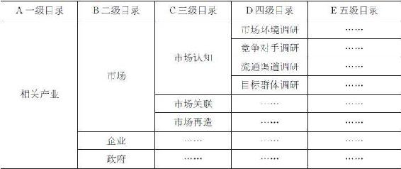在产业关联途径指标体系中,按照联动产业(A级)、产业主体(B级)、产业职能(C级)、业务类型(D级)与业务步骤(E级)的次序对产业联动行为的途径进行细分。如在某一相关产业的市场主体部分,下分市场认知职能包含市场环境调研、竞争对手调研、流通渠道调研、目标群体调研,在相应环节下还有更进一步的业务步骤分类(见表2),通过层层细化落实最终实现指标体系的合理性与可操作性。