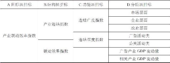 (1)目标层指标。以产业联动效率为核心,并将其指数化,建立反映广告产业与相关产业关联模式效率的指标体系。