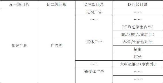 在产业关联方式指标体系中,按照联动方式(A级)、服务类型(B级)、服务职能(C级)与服务手段(D级)的次序,对产业联动行为的方式进行细分。如某一产业在广告活动类型包括广告类与公关类,广告类中包含实体广告等多种广告活动方式,实体广告下可继续分出多样的服务手段(见表3)。