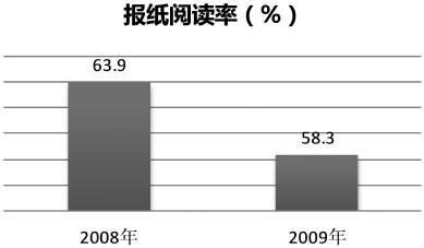 根据中国出版科学研究所对国民进行的第七次阅读调查中我们看到,我国大众2009年的报纸阅读率为58.3%,较2008年降低了5.6个百分点(见下图),越来越少的人将自己的时间和精力投入到纸媒的阅读中,这一阅读行为的变化让我们看到了纸媒所面临的市场衰退危机,尤其是青年一代对于数字移动媒体的青睐,更加让纸媒的未来发展陷入未知。