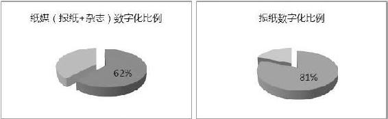 传统纸媒转型第一步便是纸媒的数字化。“我国现在已有62%的纸媒已经进行了内容数字化,报纸的数字化比率最高,达到了81%(见下图)。”