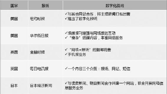 该图为国外报纸的数字化战略示意图。纵观国外报纸改革战略,再结合当今中国报业市场,我们不难发现报纸数字化的运营战略十分清晰,方式十分多样,不论从数据研究还是市场运营现状来看,报纸作为纸媒阅读的主要阵地其转型都是非常成功的。