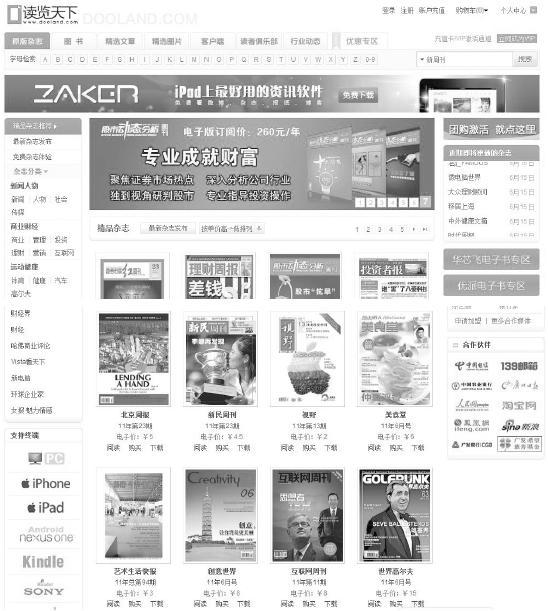 “读览天下已经在移动互联网平台上打通多终端渠道,是国内唯一能让用户在PC、iPhone、iPad、Android、Kindle、iRiver Story、SONY Reader、Nook等多平台上自由阅读的厂商。作为国内首家入驻苹果移动终端的原版数字杂志阅读服务提供商,读览天下始终引领着数字杂志阅读平台与移动终端的合作趋势。”(注:华阅数码[EB/OL].读览天下官方网站.http://corp.dooland.com/about.html.)