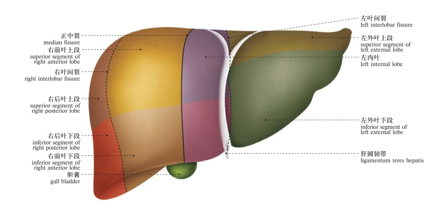 图284 肝段及肝叶(前面观)