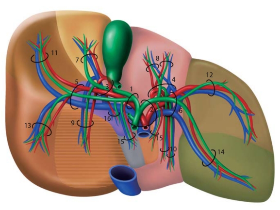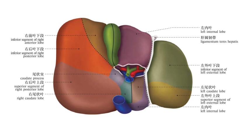 1.右支;2.左支;3.前段;4.内侧段;5.后段;6.外侧段;7.前上区;8.内侧下区;9.前上区;10.内侧上区;11.后下区;12.下外侧区;13.后上区;14.外侧区;15.尾叶;16.尾状突