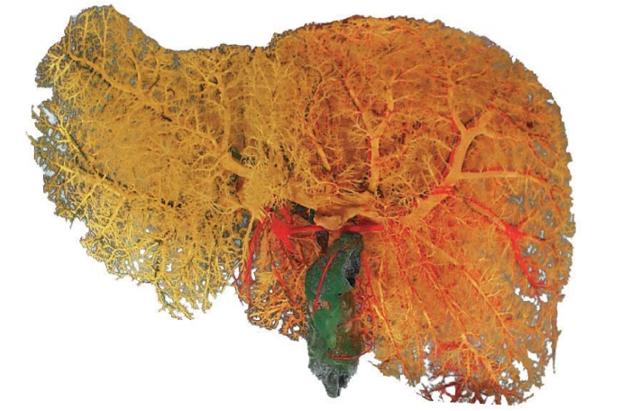 Distribution of the blood vessels and the hepatic ducts
