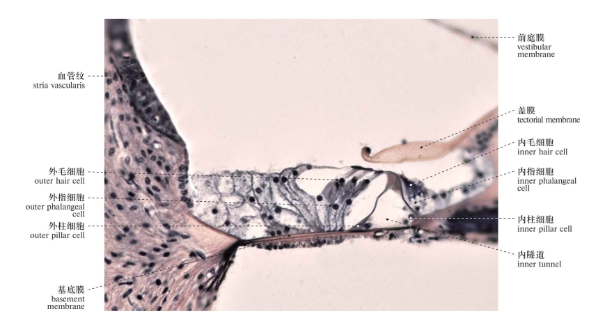 图475 螺旋器(豚鼠内耳,镀银,×400)Spiral organ (inner ear of the guinea pig, silver staining, ×400)