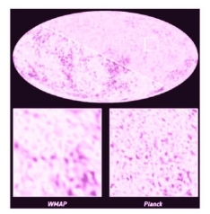 上图显示的是普朗克卫星和WMAP卫星对CMB温度涨落测量精度的比较。相对于WMAP卫星,普朗克卫星将以10倍于它的高灵敏度和近3倍于它的高角分辨率,可在30~857GHZ的9个频率波段上对全天空进行史无前例地精确扫描。从图中可以发现,普朗克卫星对CMB温度涨落的测量明显要精确很多,可以观测到更小尺度上温度涨落的结构。高精度的CMB图像可以精确显示CMB温度涨落各向异性的功率谱,特别是在小尺度上,可以对众多宇宙学模型的参数给出精确的限制,以及宇宙早期的暴涨模型和宇宙大尺度结构的形成。另外,Planck项目还会寻找大质量星系团,观测河外的射电源和红外源等。