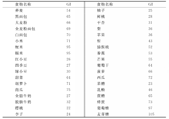 注:GI指分别摄取某种食物与等量葡萄糖2小时后血浆葡萄糖曲线下面积之比。