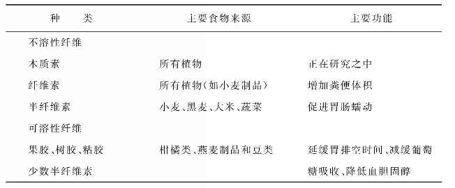 表4-1 膳食纤维的种类、食物来源和主要功能