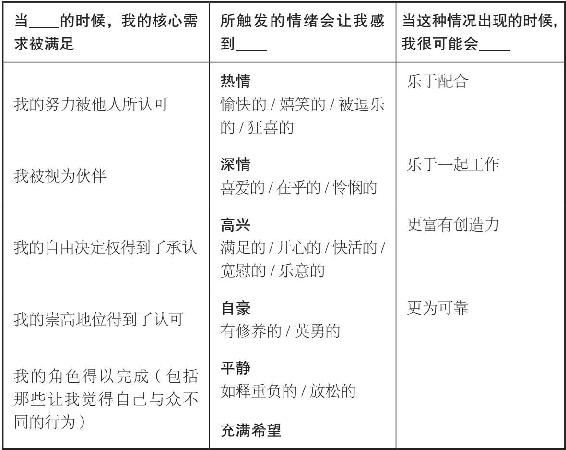 无论你是否了解某人当时的情绪及其缘由,都可以利用各个核心需求作为杠杆,激发正面情绪的产生。与识别那些负面情绪已被激起并决定如何应对相比,这种做法通常更为简单。你可以说点什么或者做点什么,解决核心需求当中某个领域的问题,调整谈判者的地位、归属感、自主权、受赏识程度以及角色,正面情绪将应运而生。