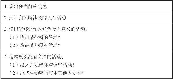 我们可以将这个流程用于各种不同场合,帮助自己或者对方建立更有意义的角色。如果你发现自己与同事、老板或者下属经常出现分歧,可以发起讨论,以明确各自的角色及相关活动。
