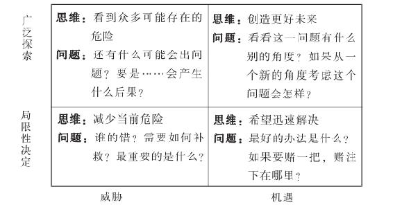 尤兰达的思维是一种危机意识,是想缩小决策范围。这两者是完全合理的。缩小决策范围对需要快速采取行动的人来说很关键,而有时危机意识也很重要(使人类得以延续)。当情况相对简单(或情况很混乱,需要快速行动以稳定系统)时,这两者的组合很重要,但这并不能帮我们为复杂问题提出创新的解决方案。用于学习和神经再生的化学物质、新脑细胞的生长,在受到压力和威胁时会停止,血液会涌向肌肉帮助我们逃离或进行战斗。作为领导者,虽然我们经常将威胁和压力作为采取行动的有力提示,但是这需要付出一定代价:当面临威胁时,我们更难发现新的情况。