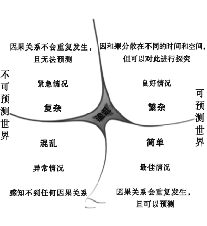在Cynefin框架中还有两个有用的域(见图2.1)。一个是不可预测的混乱域,这不是事物或问题的持久状态,而是一种暂时的分解状态,之后会变成随机状态。在这种状态里,事情需要被稳定下来,然后转移到别的域中长期存在。另一个域被斯诺登称为失序,也就是当我们面对一种情形时,没有对情况进行深思熟虑便根据自己的喜好采取行动。正如你所看到的以及即将在下面的章节中介绍的,我们的直觉和现有的习惯主要将我们带入简单域和繁杂域,很少进入复杂域。