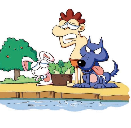 92.有一个人带着一条狗、一只兔子、一篮白菜来到河边。河水很深,已经齐半腰,所以他每次只能带一样东西过河。但是狗要咬兔子,兔子要吃菜,请问他该怎样过去?