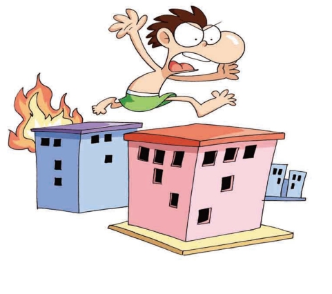 67.一座大楼发生火灾,老陈逃到了楼顶后,无路可走,便逃到了隔壁的楼顶上,两楼之间只隔10厘米,老陈却摔死了,为什么?