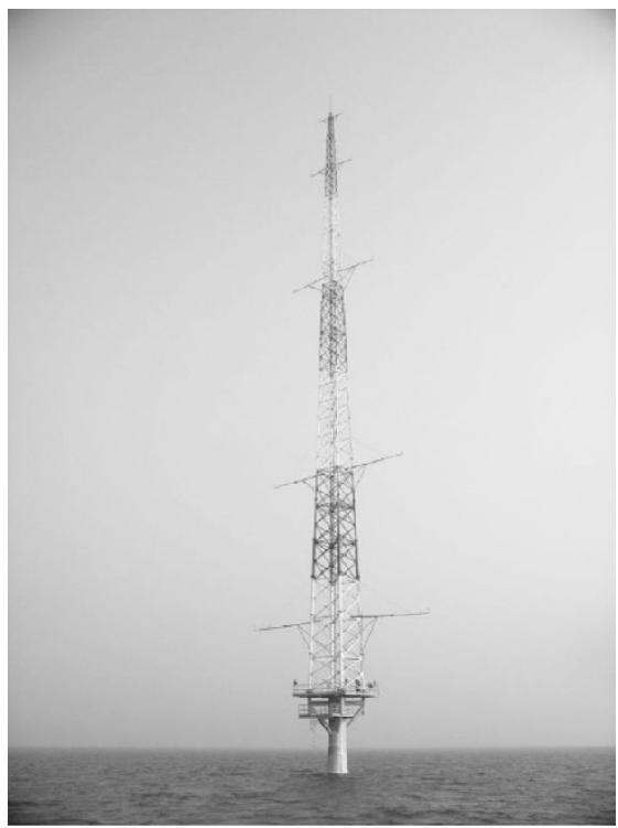 基于海上风电场的类型划分标准,海上测风塔为处于海上风电场区域(非海岛)中安装风速、风向等传感器以及风数据记录仪,用以测量风能参数的高耸结构,如图1-3所示。海上风电场开发首先需要掌握海上风能资源的变化规律和特征,而陆上气象站的测风数据并不能代表海上风资源特性,因此海上风电场建设时需要设立海上测风塔。
