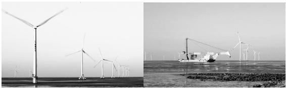 我国已建成的海上风电场中,江苏如东150MW海上风电场示范工程属于潮间带风电场,如图1-2所示。我国第一个海上风电场——上海东海大桥100MW海上风电场属于近海风电场。