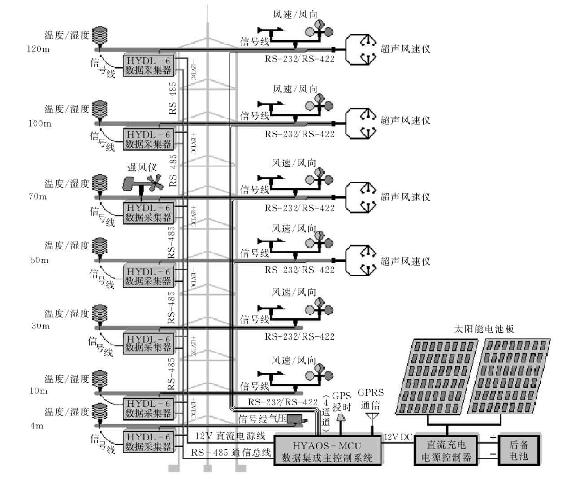 代表性的测风塔观测仪器、数据采集器和供电系统示例,即测风塔测风系统示例如图2-14所示。