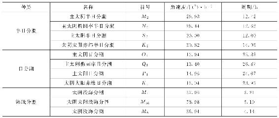 海洋水文分析中经常需要利用已有的潮位资料来推算该地点将来的潮位变化规律,称为潮汐预报,调和分析方法是当今世界上用来预报海岸海域潮汐现象的主要方法。由于潮位曲线具有明显的周期特性,在数学上可以将其分解为多个振幅与位相不同的余弦曲线的叠加,每一个余弦曲线则代表一个假想的天体在天球赤道上做等速圆周运动所产生的潮位变化过程线。每一个假想天体引起的潮位余弦变化曲线称为分潮。分潮分为天文分潮、浅水分潮和气象分潮,调和分析中分潮的个数可以是11个、64个或更多,其中最主要的11个分潮的名称、符号、角速度与周期如表3-1所示,具体分析计算时常采用最小二乘法来进行。