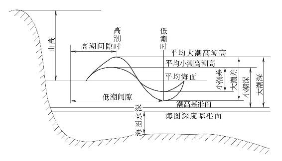 用平均海平面表示海域的深度并不方便,因为低潮位时水深为负值。为了保证航海的安全,在海图上基准深度以最小深度为宜,最小深度的基准面称为海图深度基准面。关于海图深度基准面的确定各国并不统一,我国于1956年统一采用“理论深度基准面”作为海图深度基准面,它是用8个分潮(M2、S2、N2、K2、K1、O1、P1、Q1)进行组合,通过计算得到的理论上潮汐可能达到的最低潮面。