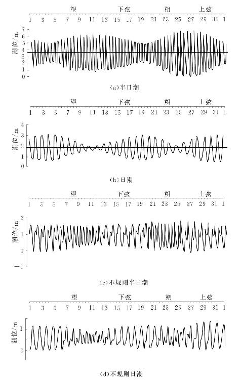 潮汐类型根据潮型数A来分类:当0<A≤0.5时为半日潮,当0.5<A≤2.0时为不规则半日潮,当2.0<A≤4.0时为不规则日潮,当A>4.0时为日潮。例如,我国青岛港的潮型数A=0.38,为正规半日潮;香港海区的潮型数A=1.4,为不正规半日潮;海南榆林港海区的潮型数A=2.7,为不正规日潮;东方港的潮型数A=6.48,为正规日潮[2]。