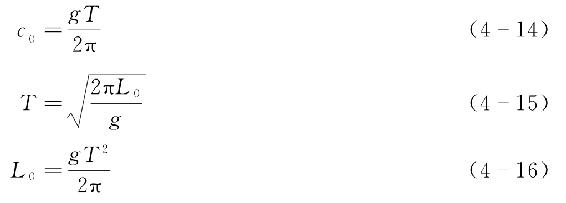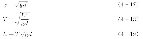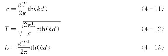 基于式(4-7)~式(4-10),可以推得有限水深条件下(0.05<d/L<0.5)波浪的周期、波长和波速三者之间相互关系为